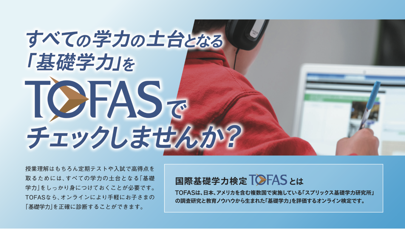 「TOFAS」は、SPRIXが実施する、グローバルに基礎学力を評価するオンライン検定です。全ての学力の土台となる「基礎学力」は、学びにおいて必要不可欠です。そして、子どもたちの教育環境が大きく変わろうとしている今、これまで以上にその重要性が高まると考えられます。